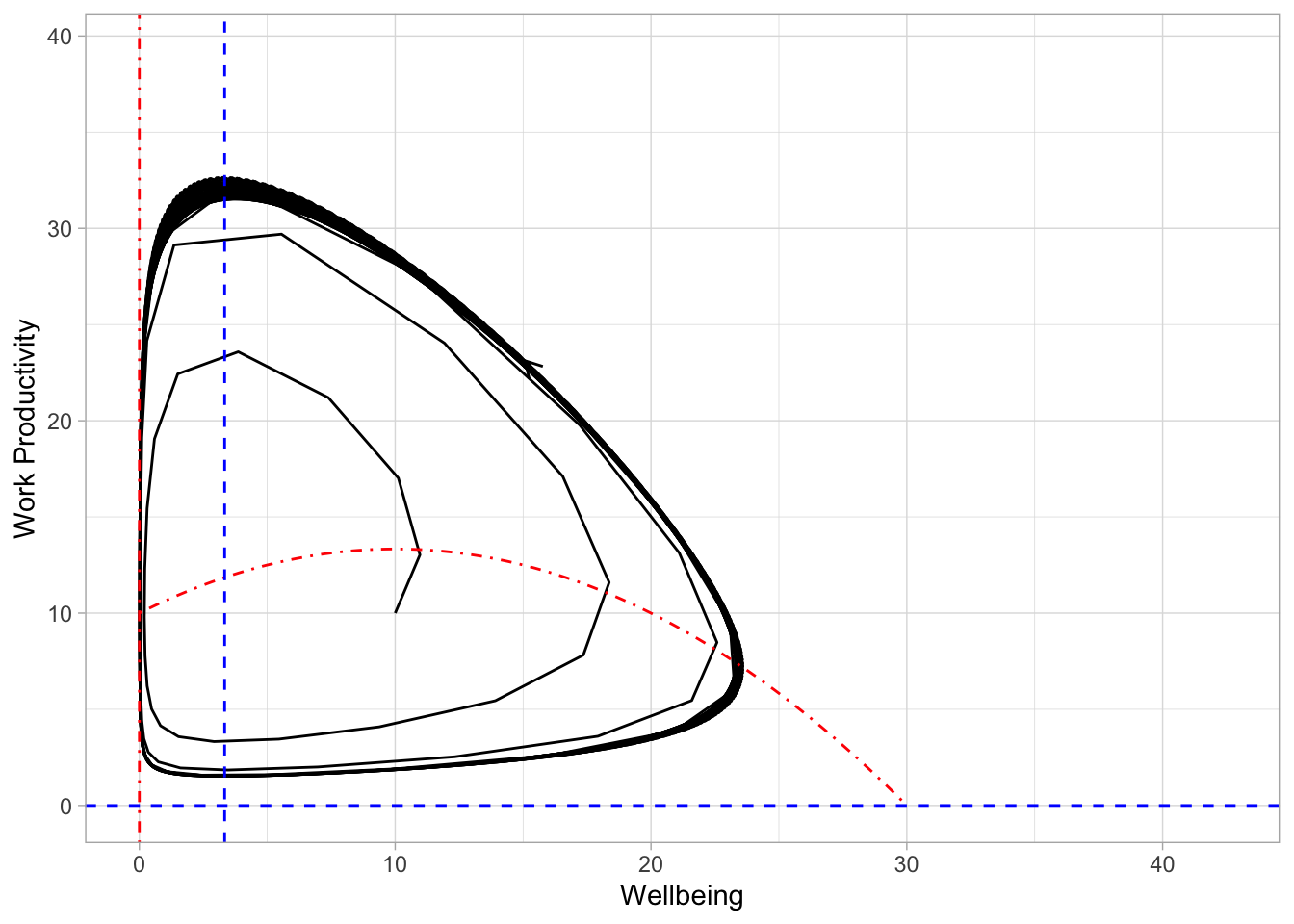 In the plot above, we can see that the formation of a periodic orbit: starting at point [10,10] and following 1000 time steps (the last step is where the arrowhead occurs). With this example, \(\theta\) was very small and so it makes sense that small changes in work productivity have large changes in wellbeing in this model. Under these conditions, large swings between wellbeing and work productivity occur.