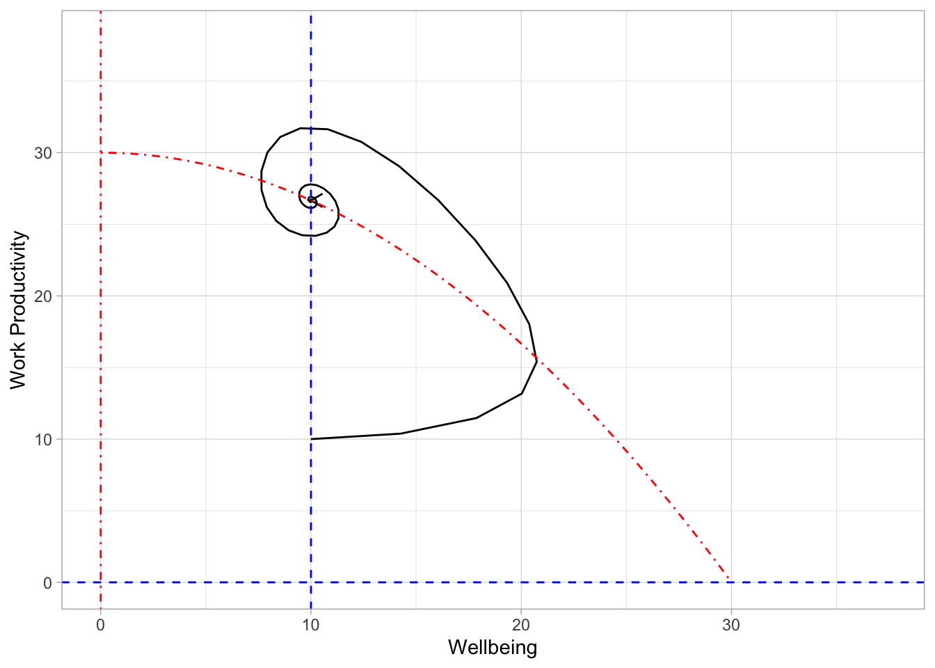 This result is analogous to that zen coworker you know. In this situation, some event occurred that knocked them off their internal equilibrium by decreasing work productivity. Following that event, their wellbeing increased which, in turn, allowed their work productivity to also increase. That increase to some maximum and then there was a back and forth. Importantly, that back and forth is continually dampened until reaching an equilibrium. Keep in mind that actually reaching the equilibrium wasn’t the point here. The b_ehavior_ of dampening down work/life towards a steady-state was one of the things I was looking for in a work/life balance model.