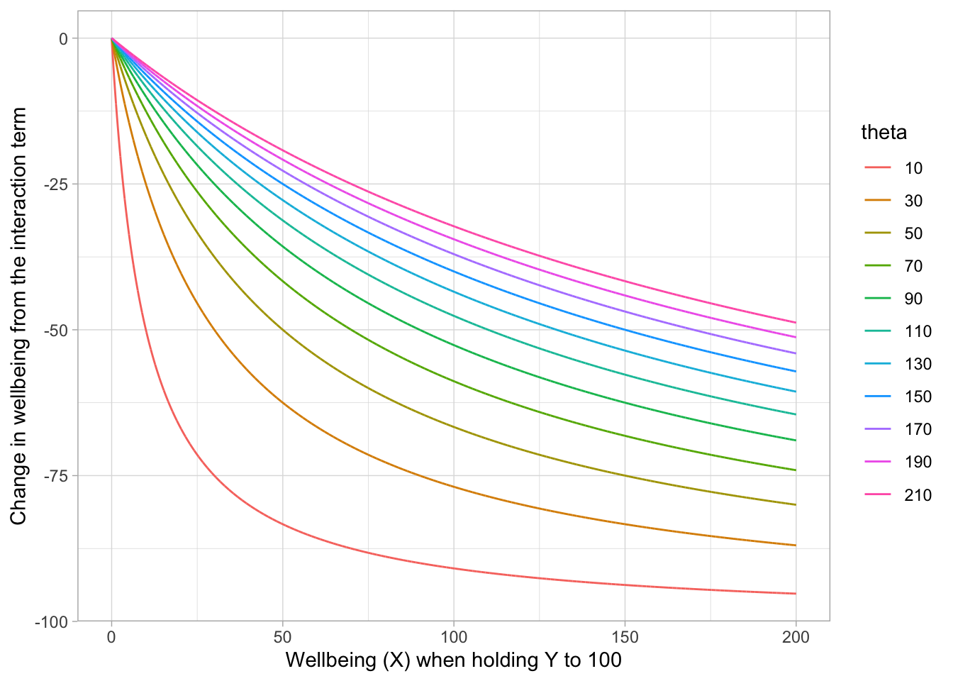 You can see that small values of \(\theta\) translate to a large response (greater negative) for any given value of wellbeing. In other words, if both wellbeing and \(\theta\) are small, the response is large and negative compared to cases where either wellbeing or \(\theta\) are larger. Setting smaller values of \(y\) does not change the relative shape of these different curves but does change the absolute magnitude–the y-axis scale–of change since it’s present in the numerator (data not shown).