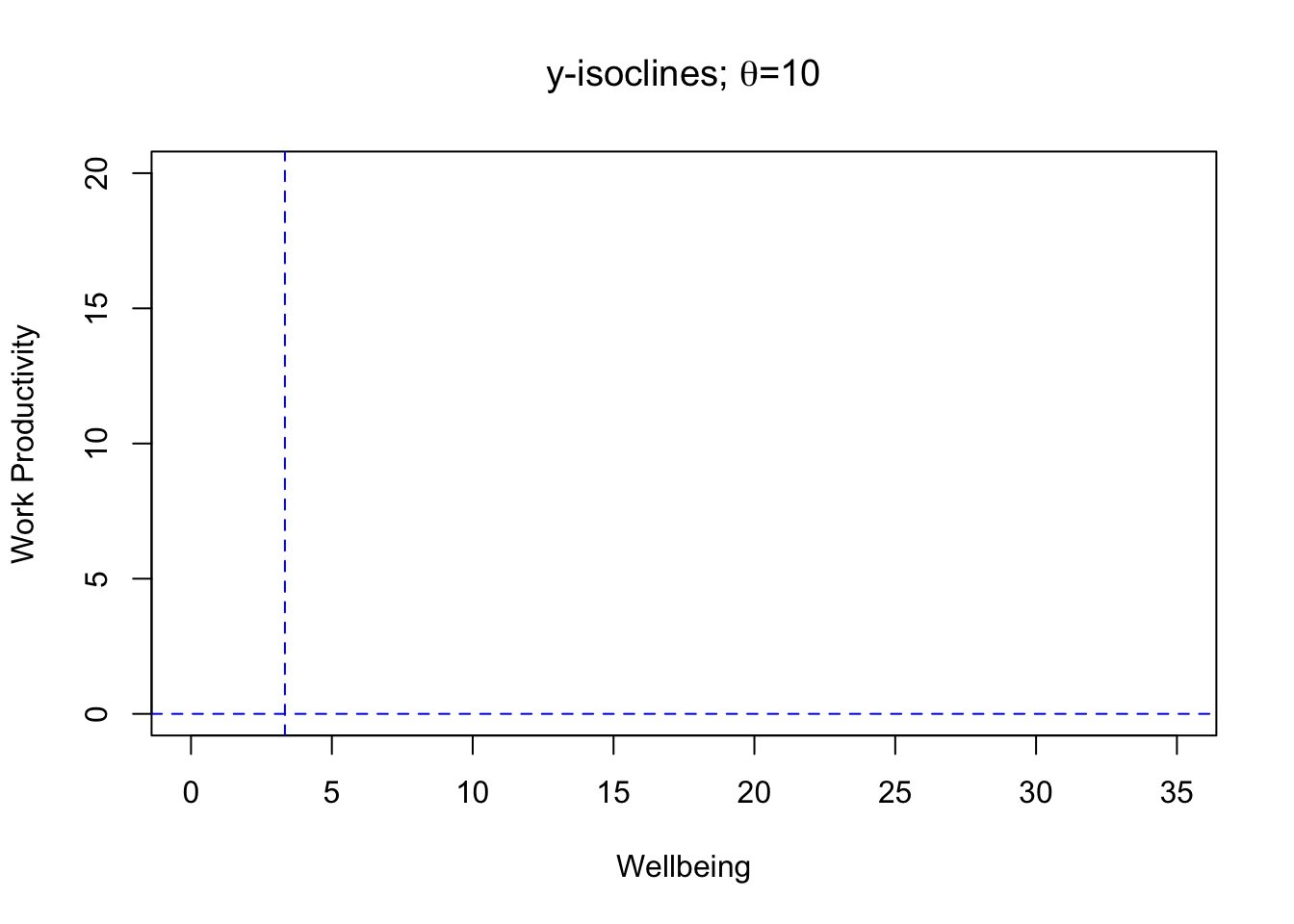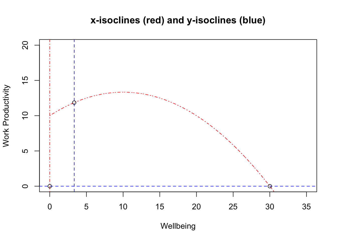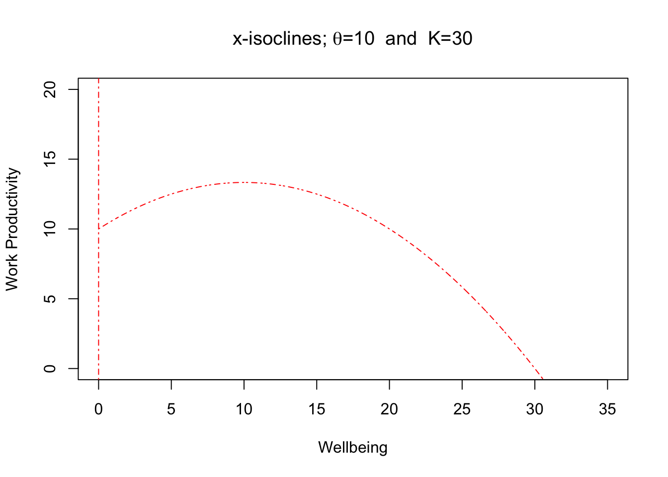 plot(x, fofx(x=x, k=k, theta=theta), ylab="Work Productivity", xlab="Wellbeing", type="l", lty="dotdash", col="red", xlim=c(0, 35), ylim=c(0, 20), main=expression(paste("x-isoclines; ", plain(theta), "=10 and ",plain(K), "=30")))